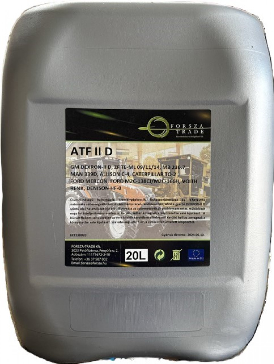 A FORSZA ATF DII széles hőmérséklettartományban használható, hosszú élettartamot biztosító hajtóműolaj. Személygépjárművek, autóbuszok, tehergépjárművek, munkagépek félautomata és automata sebességváltóinak, hidraulikus rendszereinek (pl. szervokormány) megbízható kenésére és működtetésére alkalmas munkafolyadék.